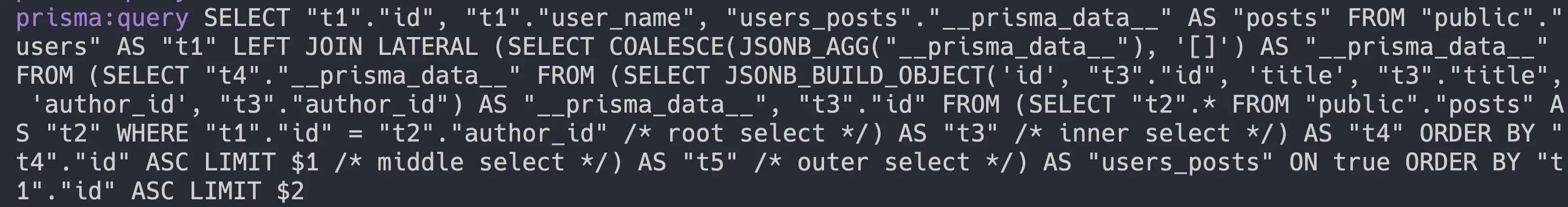 Retrieving 10 users and their respective 3 posts, as shown in the example above, appears straightforward and intuitive with Prisma. We don't need to craft long and complicated queries using LATERAL JOIN, as demonstrated in the image above. I pretty printed the query above and got the following: