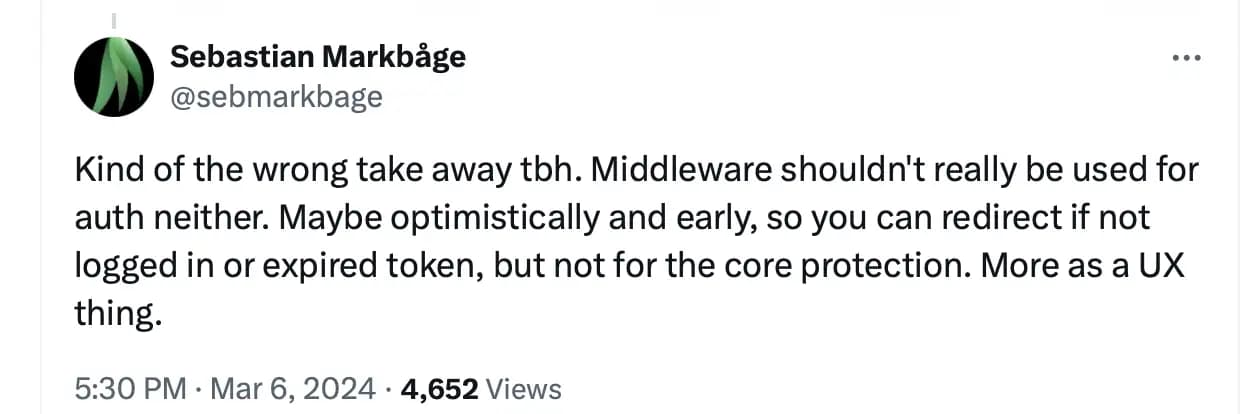 However, Next.js does not recommend protecting your routes in a layout, as you can read on the Authentication page in the Next.js documentation. It is recommended to use middleware for route protection. Yet, Sebastian Markbåge, formerly of the React core team and now at Vercel, tweeted that middleware shouldn't be used for auth either, which adds to the confusion.